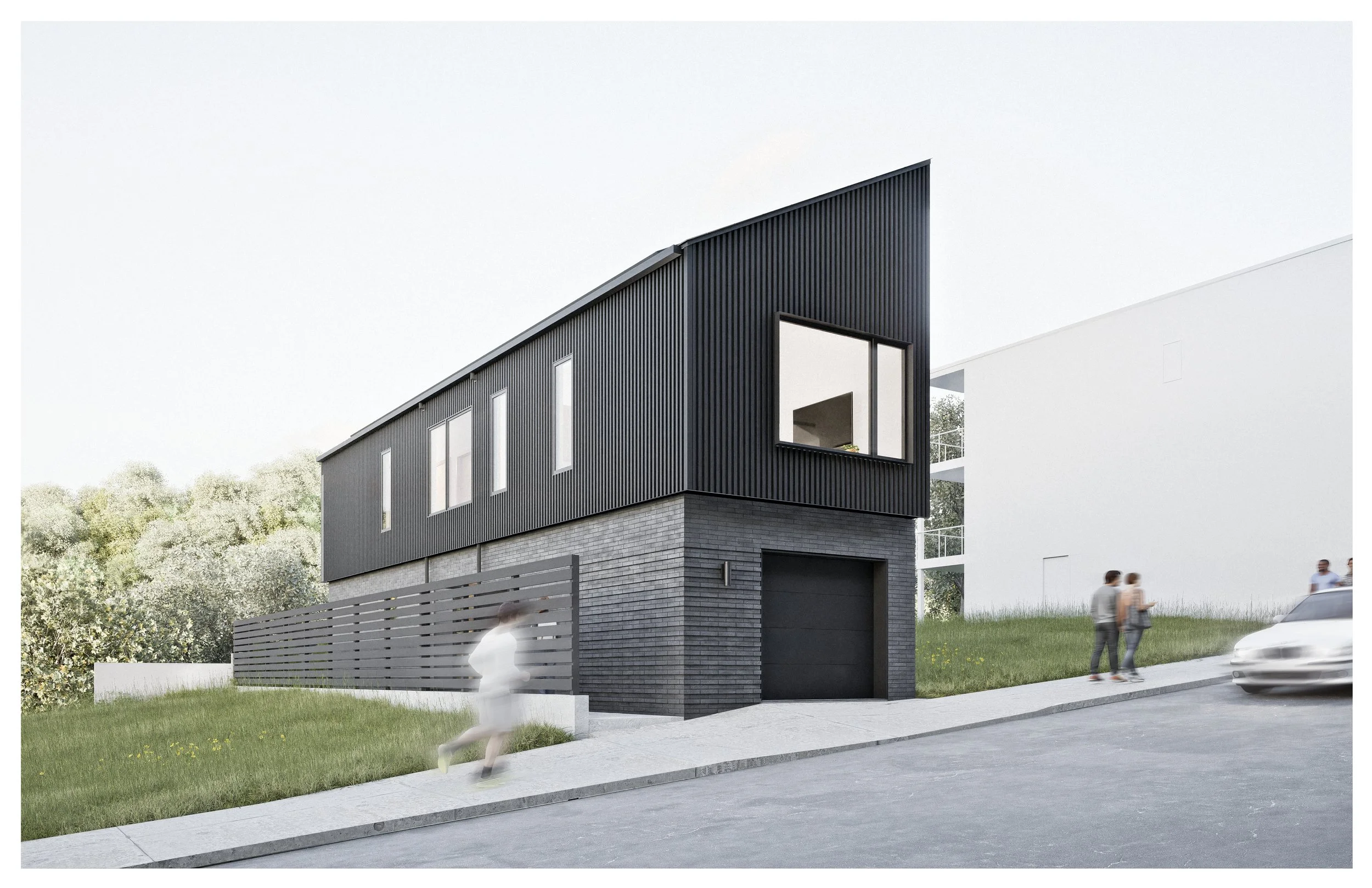 This infill prototype serves as a model for affordable, high-density urban development, designed to support a more space-efficient lifestyle. Its simple design, ease of deployment, and scale challenge the spatial norms of suburban living—such as multi-car garages and expansive private lawns—by encouraging residents to embrace compact, walkable environments that prioritize shared spaces, public transit, and community-oriented design.